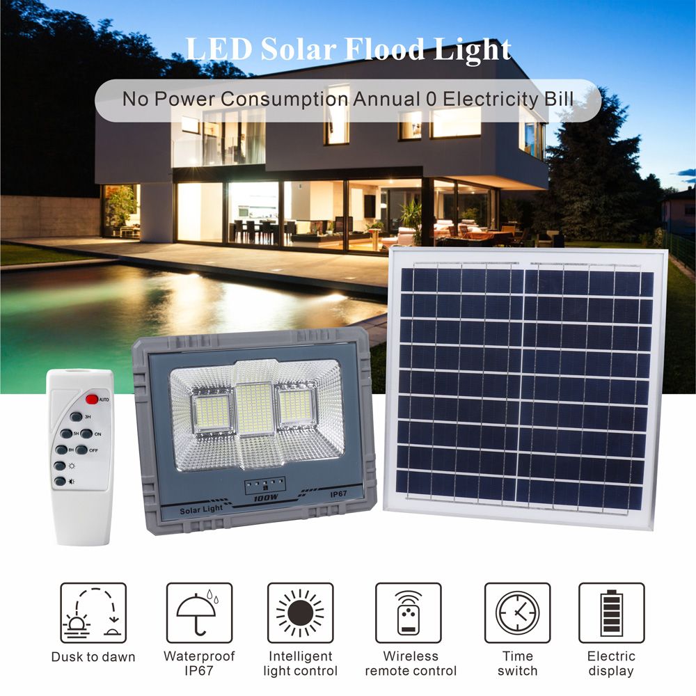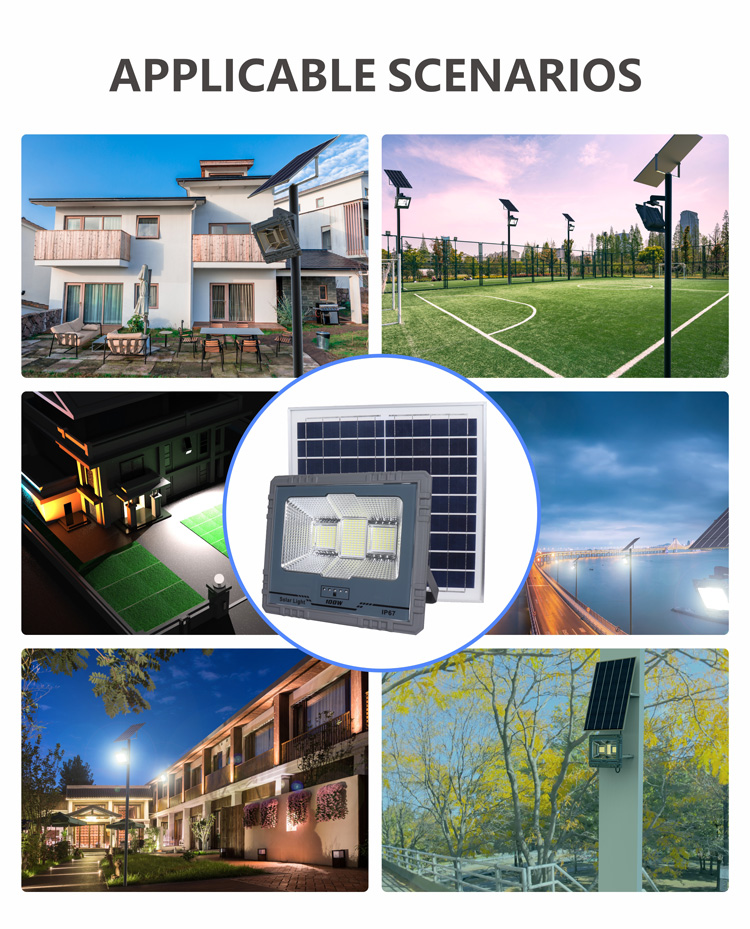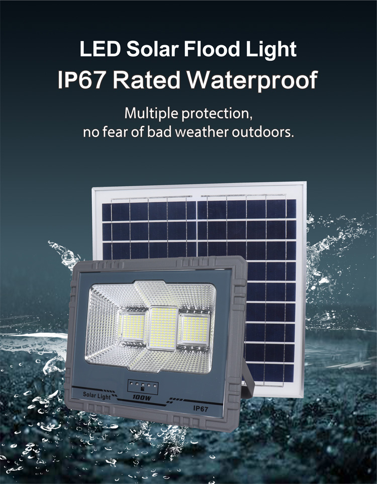 100W太阳能投光灯 IP67户外防水LED太阳能景观灯庭院、花园、游泳池、篮球场高亮便携式太阳能灯照明